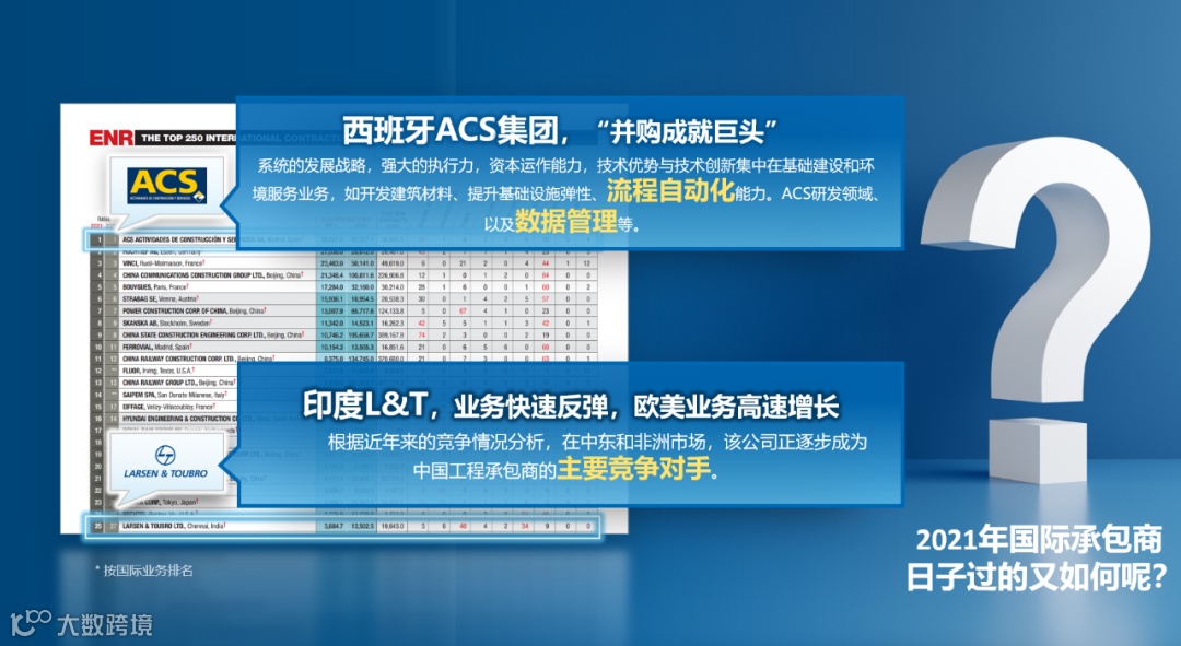 为便于分析疫情后的发展趋势,对标国际工程市场的竞争对手,此次特别选取了ENR排名前25位的两家有代表性的国际承包商,西班牙ACS集团和印度L&T进行比较,希望以此来观察国际工程行业的业务恢复情况,以及未来的竞争态势。