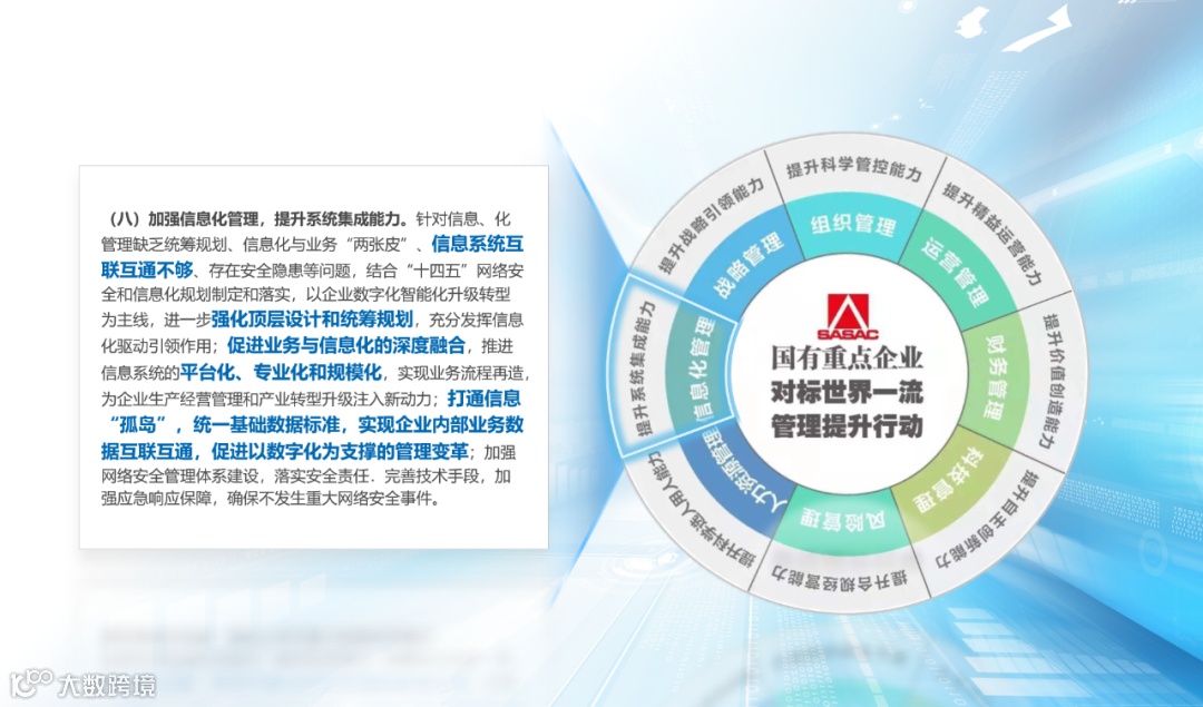 其中第八项提到“加强信息化管理,提升系统集成能力”。打通信息孤岛,统一基础数据标准,实现企业内部数据互联互通,促进以数字化为支撑的管理变革。