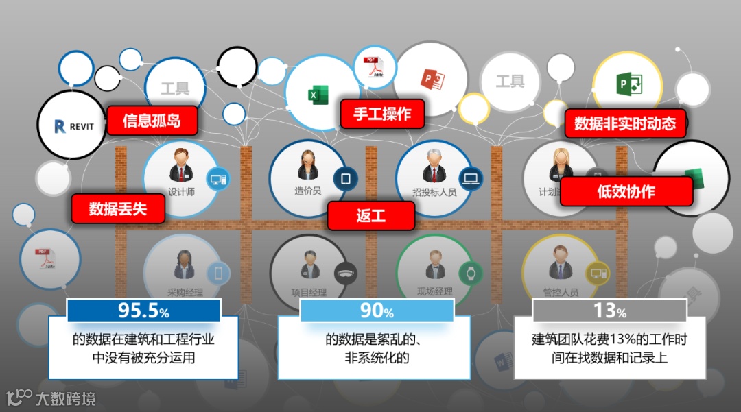 那最终导致的结果是什么?国际顶级管理咨询公司FMI的一份报告显示:95.5%的数据在建筑和工程行业中没有被充分利用,90%的数据是紊乱的、非系统化的;13%的建筑团队花费13%的工作时间在找数据和记录上。