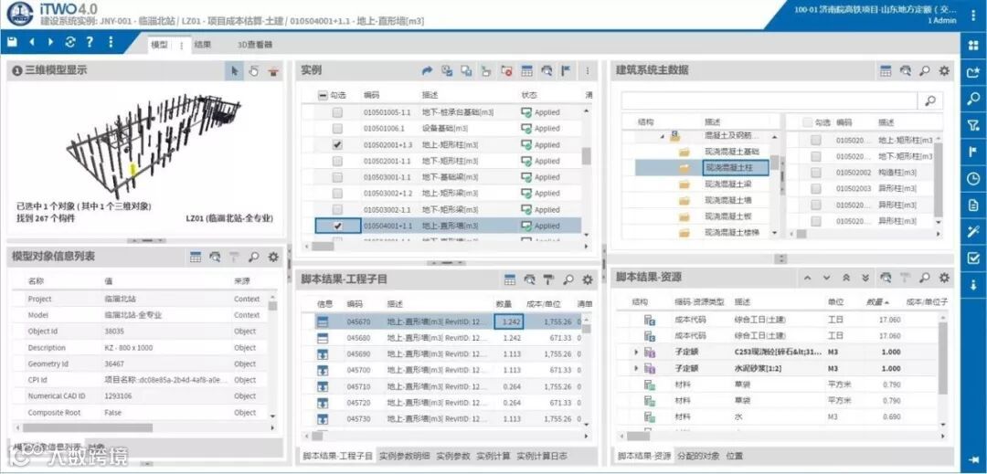 模型导入后,进行算量计价工作,iTWO 4.0可实现算量预匹配,有效减少重复算量工作。为了辅助计价,中铁工程设计咨询集团在iTWO中预先录入了铁路定额库和山东省地方定额库。基于定额库,将模型与工程量清单挂接,完成计价。