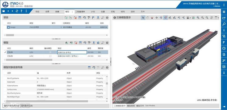 模型校核阶段,中铁工程设计咨询集团用Revit进行建模,模型建立完毕,导入iTWO平台,进行模型校核工作,随后开展算量计价及项目管控工作。