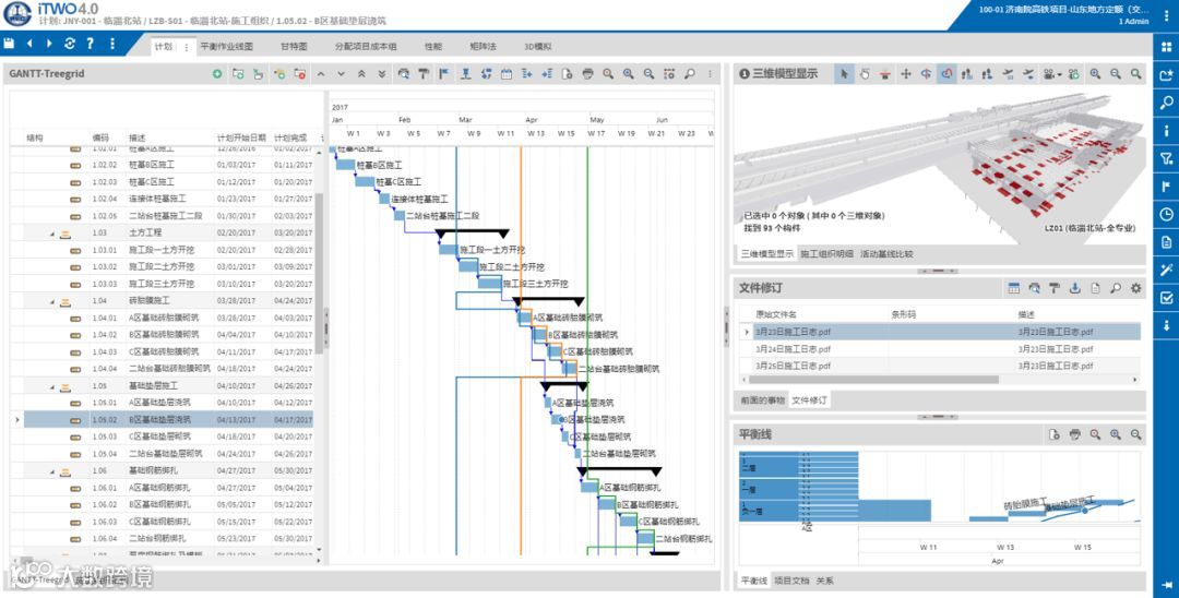 完成算量计价后,将工程量清单与进度计划对接,最终实现项目的5D虚拟建造,并根据结果调整进度、优化成本控制,完成虚拟建造。进入施工阶段后,指导施工单位据实录入实际进度,颗粒度细化到周。建设方通过协同平台查看项目进度,针对实际数据进行月度考核。iTWO 4.0进度计划灵活性高,其平衡作业线功能能实现计划进度与实际进度对比,更方便决策。