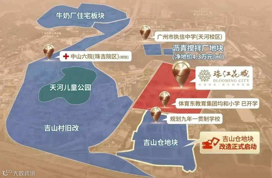 目前,珠江花城南侧吉山仓地块清拆已启动,后续成为储备用地,规划公园绿地和九年一贯制学校;此外,中山大学附属第六医院(珠吉院区)项目已落址珠吉路,共分两期建设,一期预计2027年竣工。