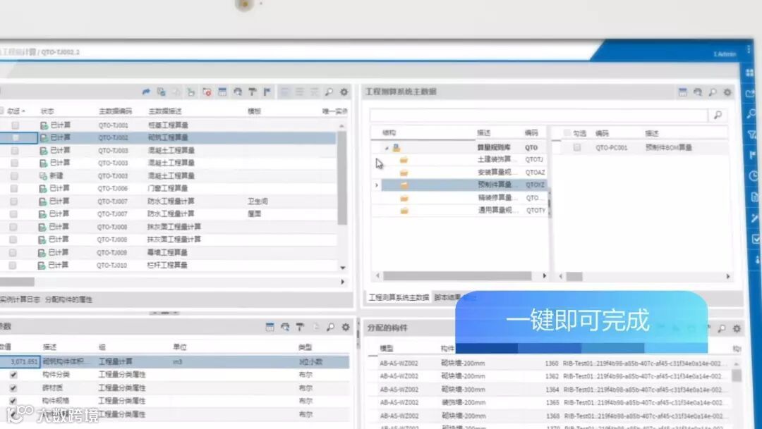 算量计价模块内置国家和地方数据库,通过系统预设企业标准、价格库和智能计算规则,“一键”即可轻松快速完成基于模型的工程算量和计价,并与具体构件相对应以供实时查看,大大提高效率,缩短项目周期。