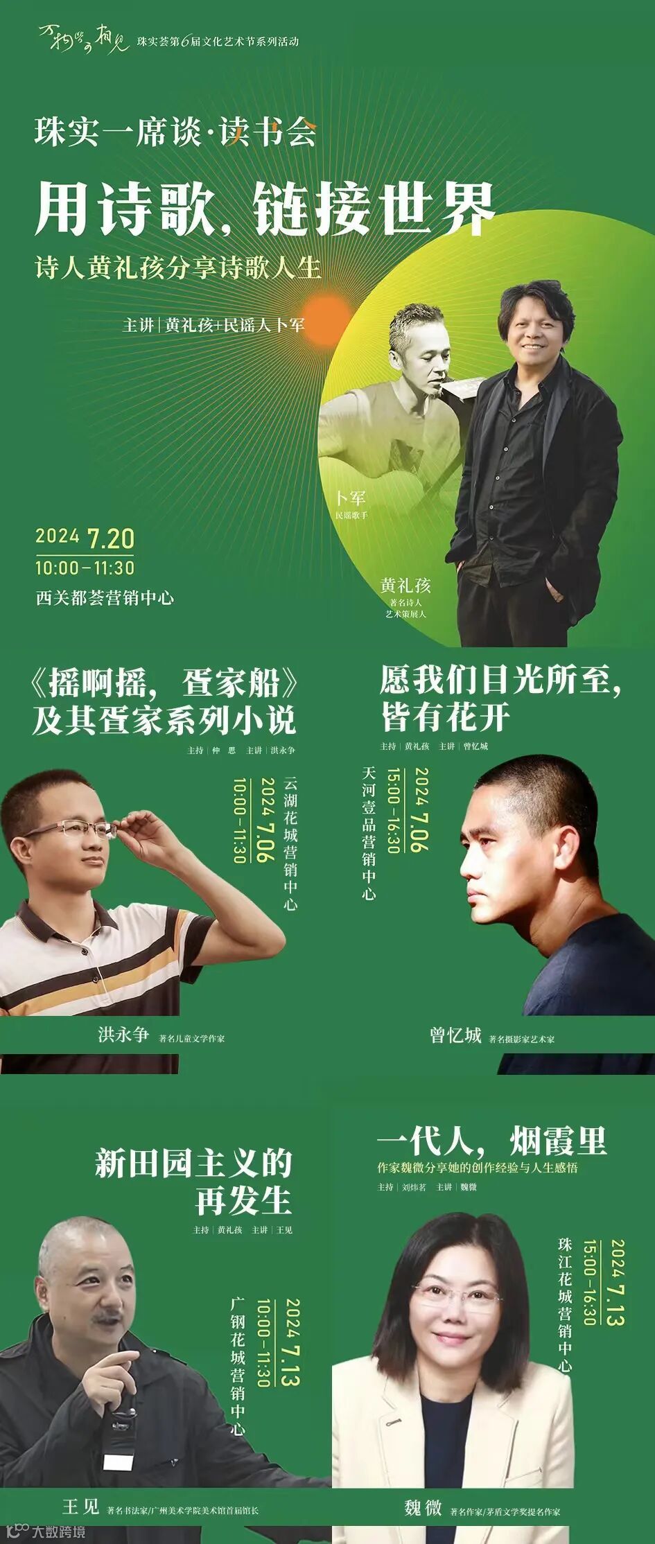 阅读就是生活。本届艺术节特邀魏微、黄礼孩、王见、曾忆城、洪永争、卜军等文学及艺术界的名家,来到珠实地产五大项目进行文学及艺术的分享。书香与茶香交织,感受文化人生。