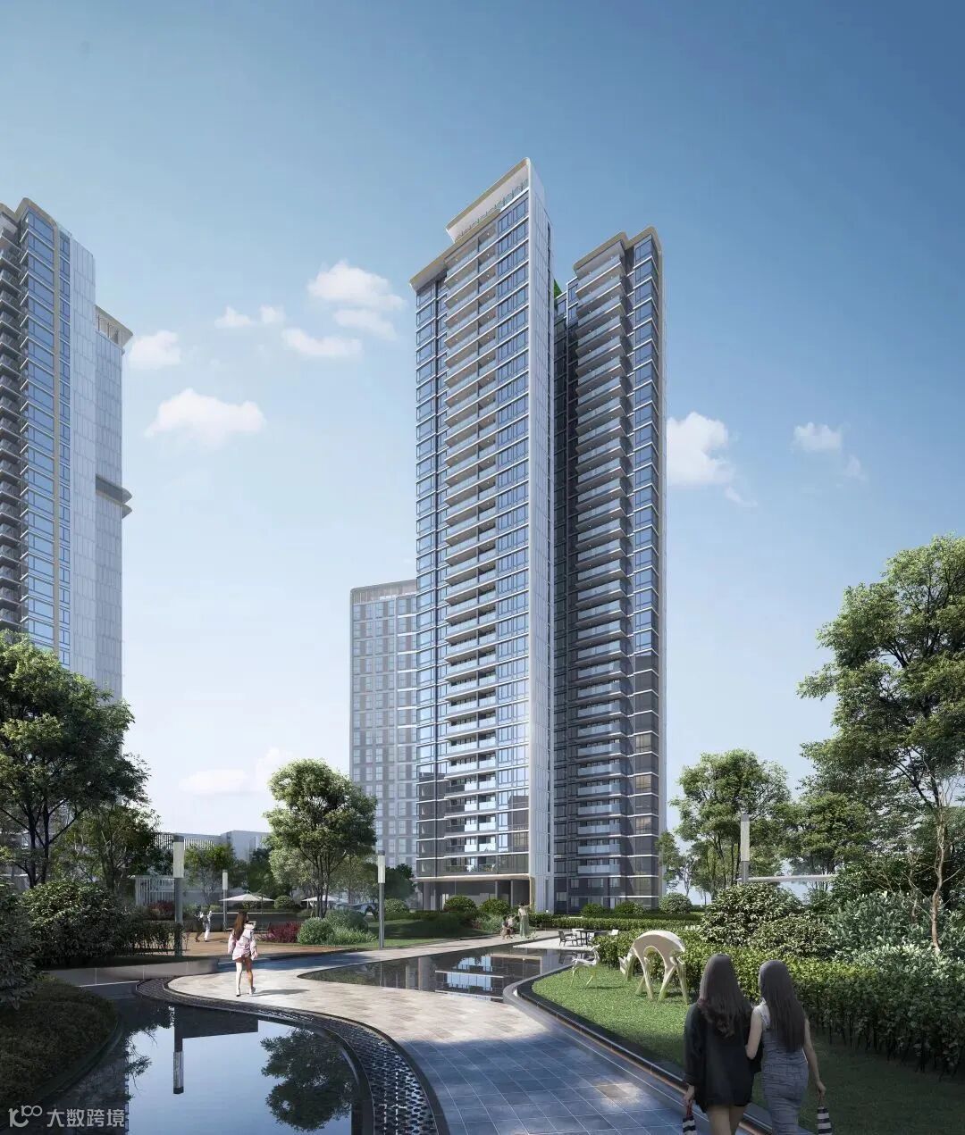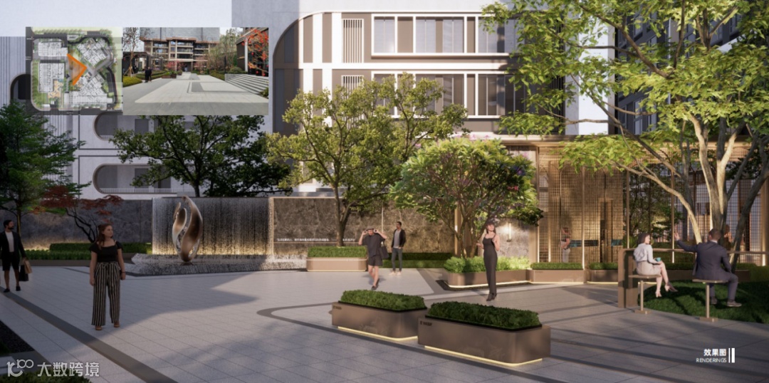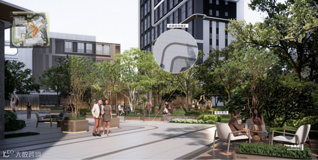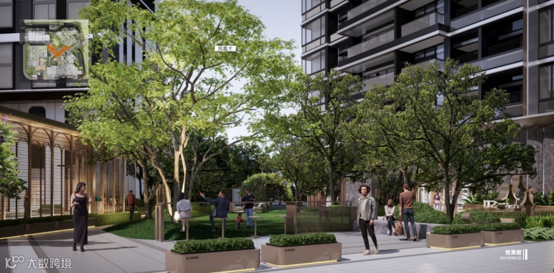 在立面设计上,融合现代时尚与岭南建筑风韵,通过外墙涂料结合仿木纹铝板的外立面、岭南风入口大堂与沿街裙楼、以及如灯塔一样的特色塔冠造型,彰显都会前沿的审美品味。