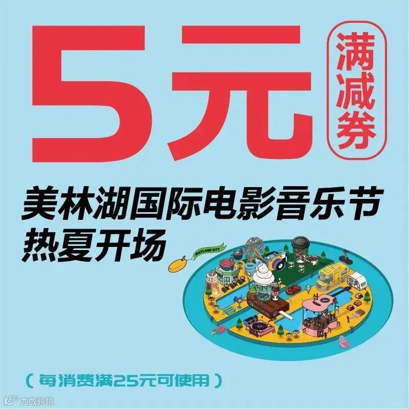 并附文字【有搭子约起打卡#美林湖国际电影音乐节 的吗?】 即可在活动现场服务处免费领取满减券(每消费满25元可使用1张)