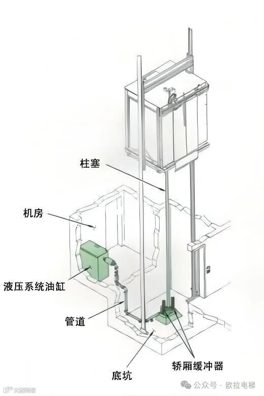 2、电梯轿厢和曳引电梯一样,通过轿厢侧面(或后面)布置液压缸,通过液压泵打压和泄压来实线上下运行的功能。