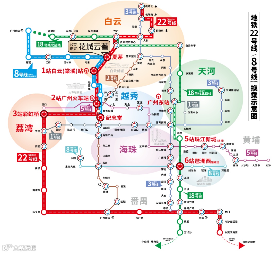 其中22号线更是时速160KM/h的广州至快地铁之一,链接白云机场、白云站、火车站、广州南站、南沙客运港等海陆空7大枢纽,未来也将通往大湾区两岸城市。