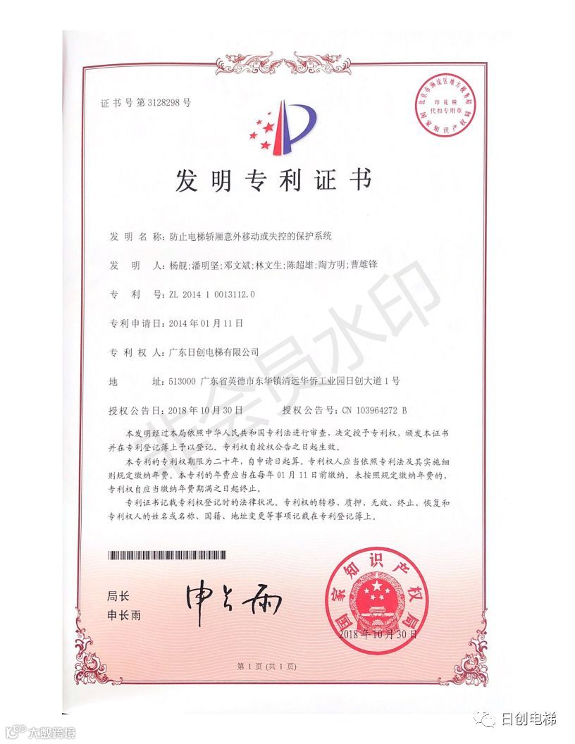 10月30日,我司获得国家知识产权局颁发的发明专利--《防止电梯轿厢意外移动或失控的保护系统》。GB7588-2003《电梯制造与安装安全规范》国家标准第1号修改单要求增加UCMP功能(轿厢意外移动保护),且于2016年7月1日实施,我司于2014年1月11日已经申请该项发明专利,彰显公司实力,及未雨绸缪。