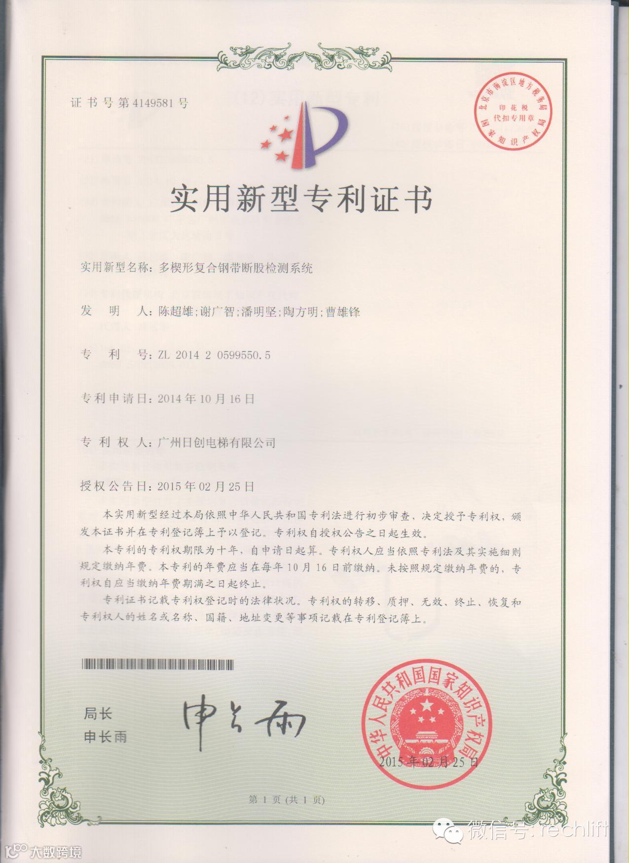 近期,公司荣获“多楔形复合钢带断股检测系统、多楔形复合钢带曳引电梯系统”等多项关键技术专利,为公司在研发REMOST钢带曳引客梯技术奠定坚实基础,为今后新产品推出做好充分的技术储备。