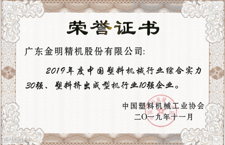 被中国塑机工业协会评定为2019年度综合实力30强,塑料挤出成型机行业10强。