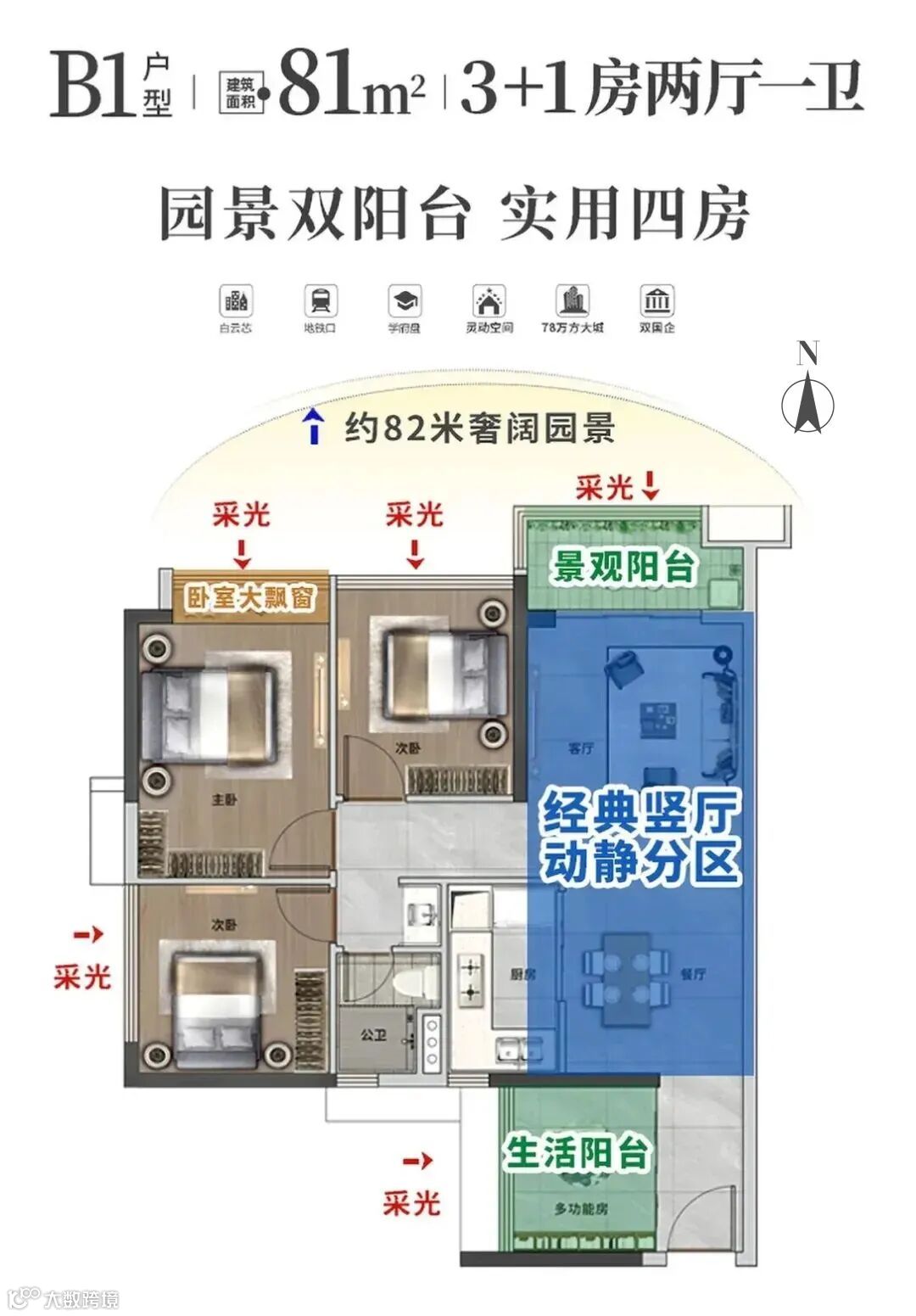 建面约81㎡拥有四房超高性价比,三房价格尽享四房空间;