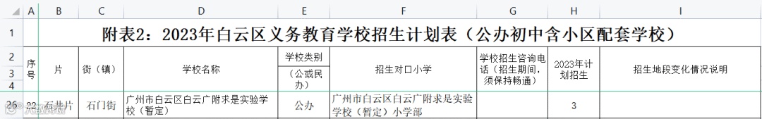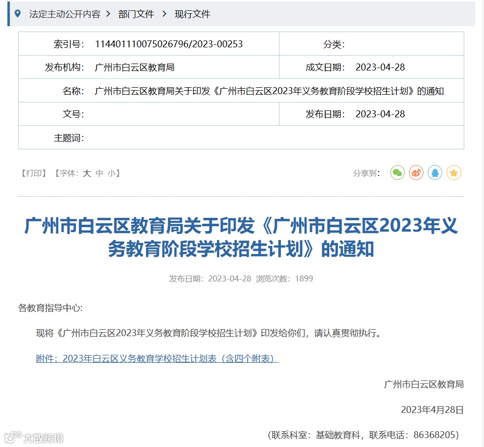 信息来源: 广州市白云区教育局关于印发《广州市白云区2023年义务教育阶段学校招生计划》的通知。