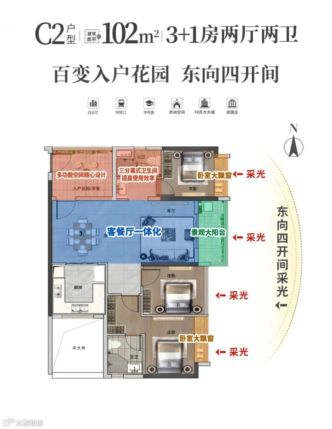 东向四开间,无遮挡望白云湖景,每天早上尊享阳光“叫醒服务”;
