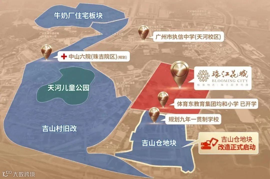 首先是地段优势。珠江花城地处天河热门板块—天河智谷板块。作为天河重点功能片区用地,天河智谷近几年发展势头强劲,与国际金融城、琶洲连成轴线,形成三足鼎立之势。目前已聚集了网易、中国移动南方基地、太平洋网络、小鹏汽车等2500多家高科技企业,以及近50家总部型企业,吸引了大量人才涌入,高新企业集聚效应显现,预计未来将实现产值超1000亿元的生产总值。