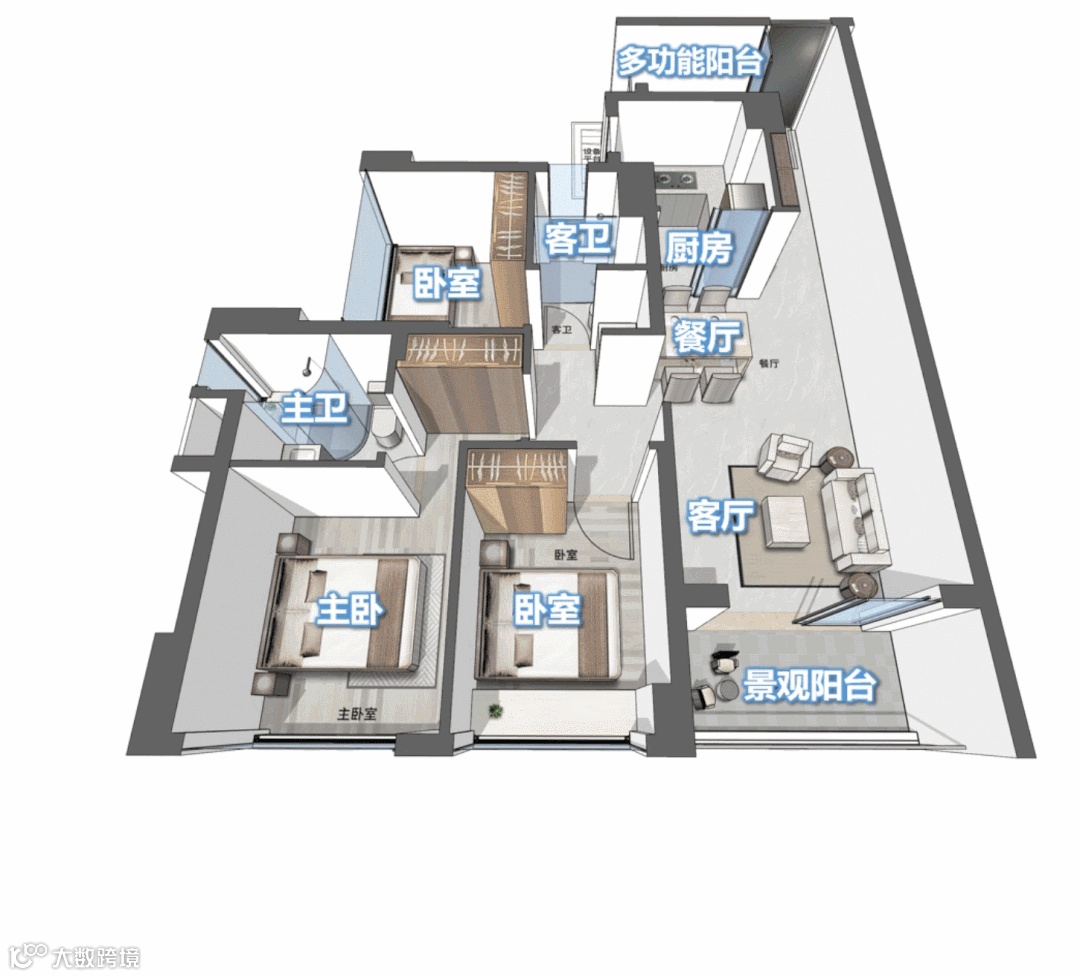 88㎡竖厅3+1房,整个户型通透明亮,科学布局,动静分离。多一房设计,可改造成书房、健身房、儿童游乐室等,给家人带来更多幸福生活体验。