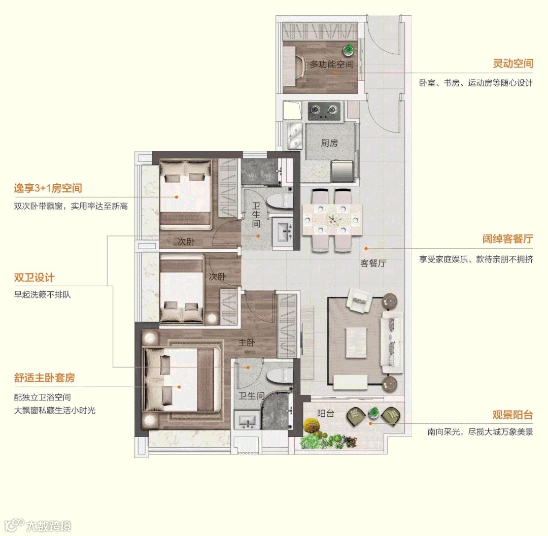 该户型采用大横厅、四开间朝南设计,南北对流,双面采光,提升居住的品质感和舒适感。