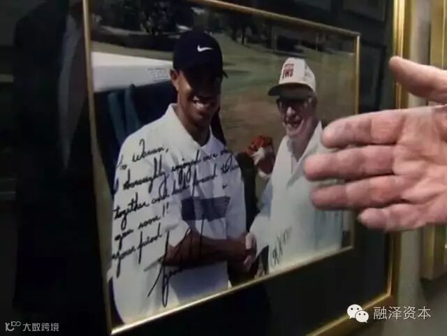 巴菲特解释说:“这是我和泰格·伍兹的合影,那是几年前在爱荷华的一场高尔夫比赛中,我做伍兹的球童,他是一个非常优秀的学生,我给他当球童时提出的所有建议,他都采纳了。”
