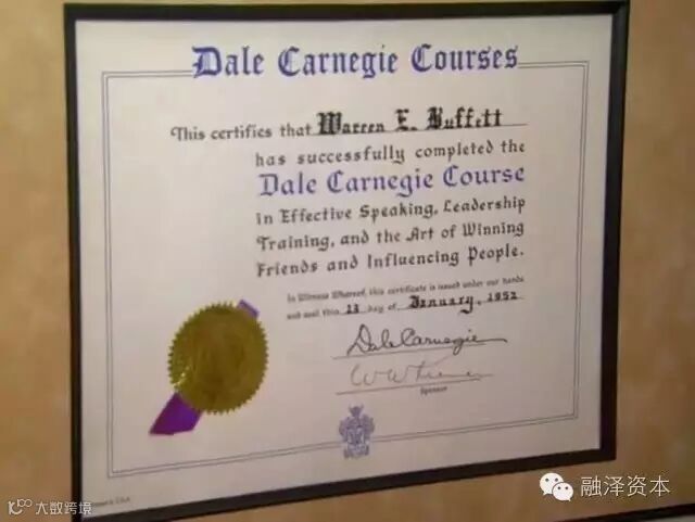 很多人喜欢在办公室里挂上自己的毕业证书,巴菲特也挂了一张,不是大学毕业证书,也不是他在哥伦比亚大学研究生毕业证书,而是一张他在1952年参加戴尔·卡内基培训课程(关于有效演讲和领导力培训以及记得朋友和影响别人的艺术)的毕业证书。