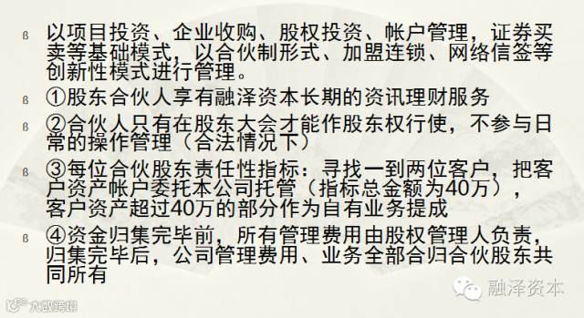 融泽资本以“融众之智,泽惠天下(天下股民)”为宗旨,坚守“诚信为本,专业立足,坚持创新,协作共赢”的核心理念,为用户打造出一个诚信、透明、公平、高效的企业金融服务平台,充分发挥信息优势,技术过硬的作用。