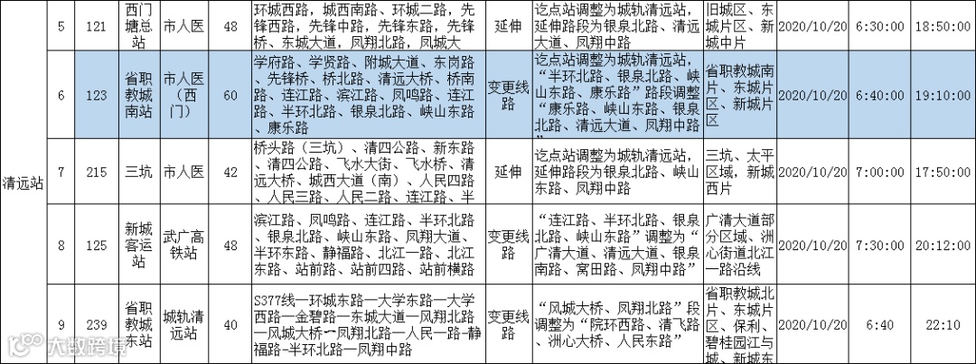 新开线路为5条,分别是城轨清城站到源潭、华南863、高铁站、省职教城、广清产业园、太和洞等地,途经市区人民路、凤翔大道、站前路、广清大道、清远大道等主干道。