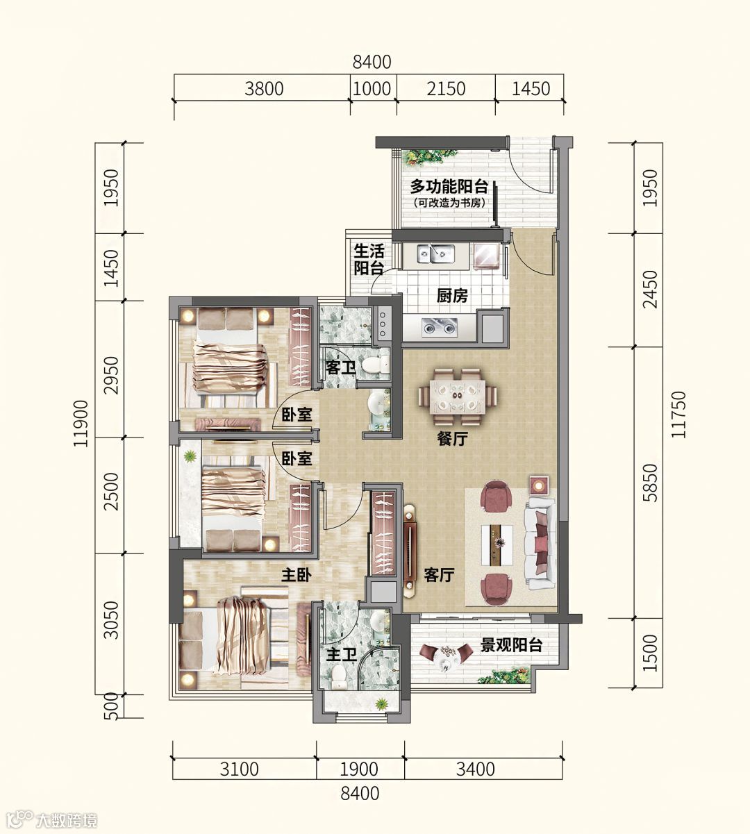 大家可以看看这个户型,动静分区的设计,生活阳台的贴心设计,以及客卫三分离设计。