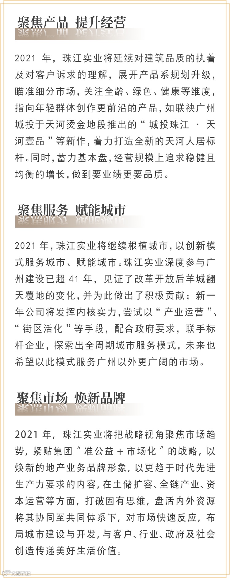 2021是备受期待的一年——“十四五”规划将开启中国全面建设社会主义现代化国家新征程、向第二个百年奋斗目标进军;我党将迎来建党100周年;粤港澳大湾区迈进三年行动计划的冲刺关头……珠江实业将继续响应中央坚持关于“房住不炒”、租购并举、因城施策的要求,促进房地产市场平稳健康发展,围绕“三个聚焦”夯实全周期综合竞争力:
