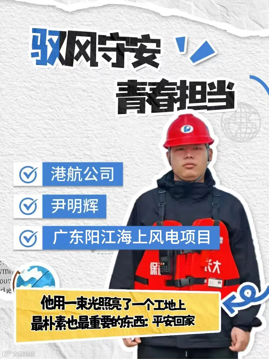 常年与风浪为伴,他的皮肤被海风烈日淬得黝黑,眉宇间还带着未脱的少年稚气,眼神却沉稳锐利、坚定有力,在安全原则面前寸步不让,守护着项目每一道工序、每一台设备、每一位工友。一声“大哥”,是工友们对他最朴素的认可,也是最沉甸甸的信任。他以青春赴使命,以实干护平安,在项目一线,用一次次隐患排查、一次次险情处置,书写着青年安全管理者的责任与担当,彰显了施工安全人的使命与风采,成为项目一线最可靠的“平安守护者”。