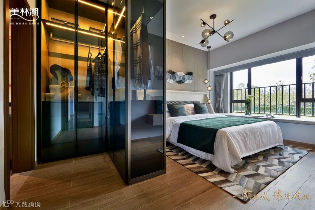 主卧除了开放式衣柜、床头柜,还有简约梳妆台及步入式衣帽间。每天洗漱完毕,太太梳妆打扮一番后,新款的手提包、限量的高跟鞋、一直钟爱的小外套、高贵典雅的晚礼服……都可在这里随意挑选、任性装扮,走出房间便是一次华丽的登场。