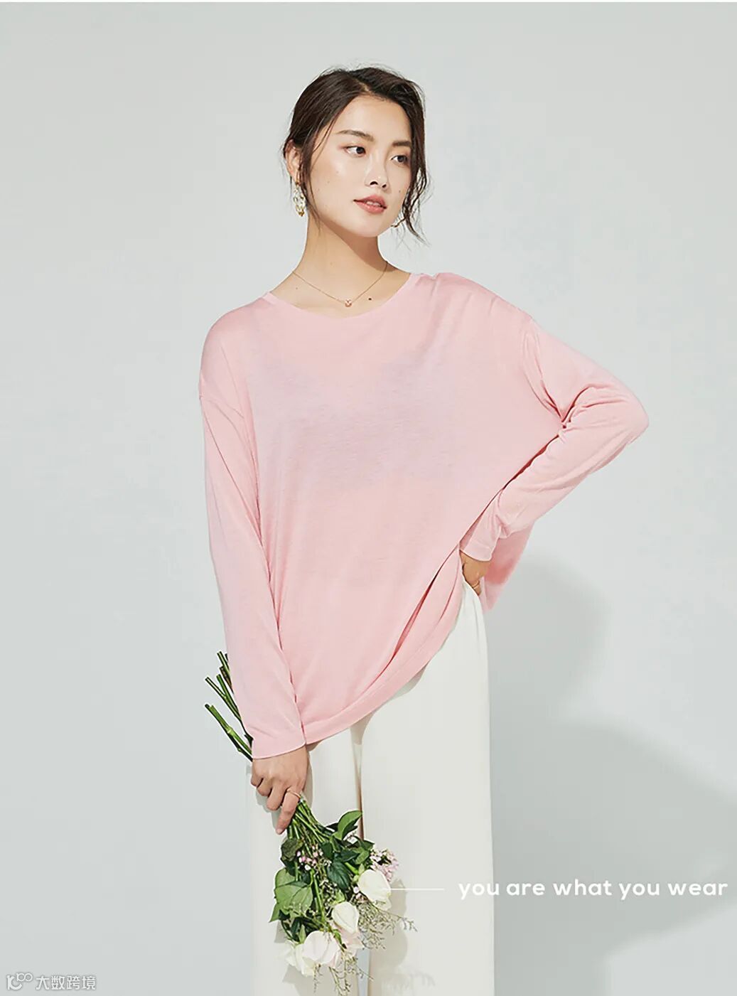 身着一件浪漫粉色的T恤优雅而美好