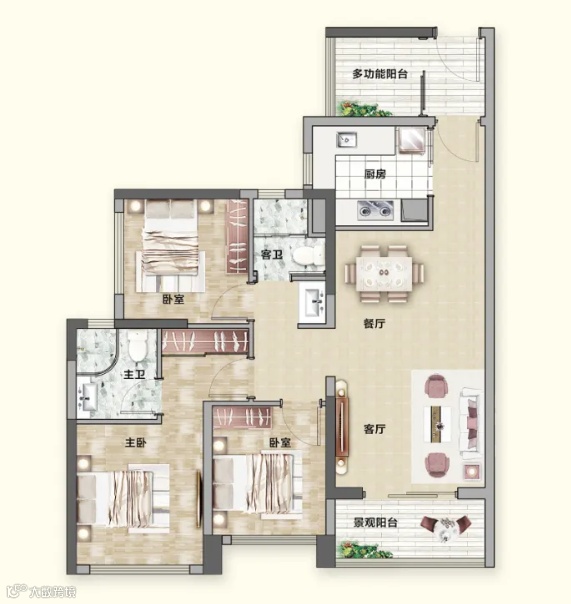 89方的3+1房两卫户型,不仅做到了将面积控制在90平方米以下,同等面积多一房,更打造了三开间朝南,向阳而生的生活方式!