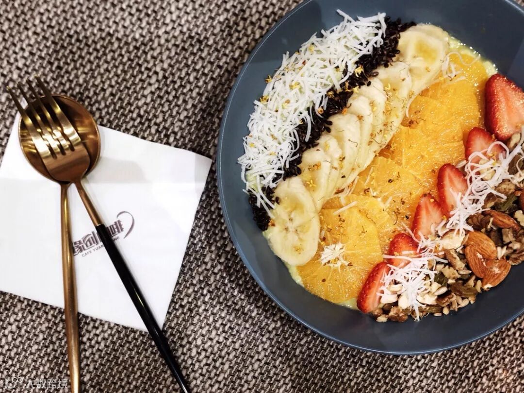【元气满满果昔碗】:底层牛油果打底,所以口感很绵滑,上面也放了香蕉和橙子、草莓、坚果、椰丝等,层次也很多。