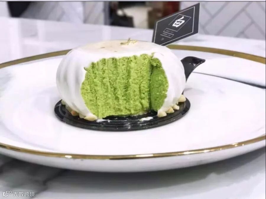 【抹茶覆盆子慕斯】:外表雪白,用勺子划开,抹茶的绿色映入眼帘,再里面是覆盆子酱。浓郁的牛奶、绝味甘苦的抹茶、酸甜的覆盆子酱,三重口味一起在嘴中爆发,一切都是最好安排。