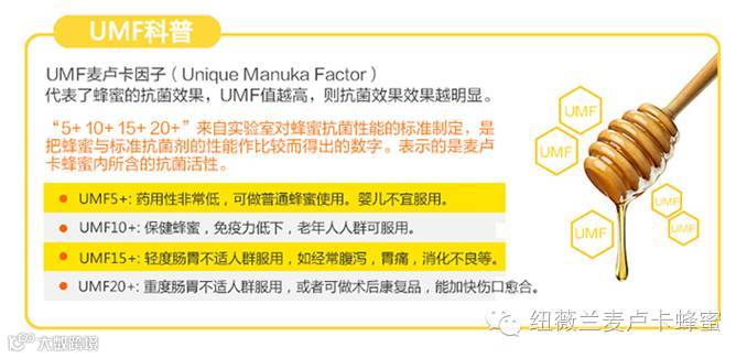UMF指"独特的麦卢卡效用"(Unique Manuka Factor),指的是活性麦卢卡蜂蜜里含有的抗菌成分。麦卢卡花只生长在纽西兰。这种花的花蜜含有一种奇特的疗效,而UMF就是测量麦卢卡蜂蜜里的抗菌成分程度的指标。