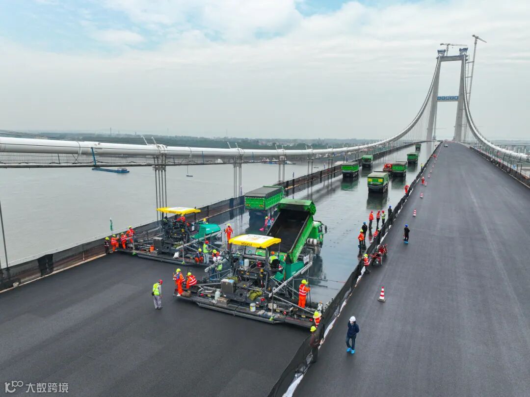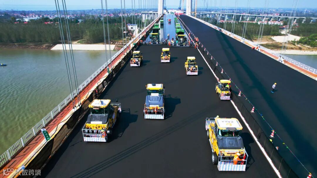 项目团队施工中创新应用智能建造技术,创造了环氧沥青单日铺装面积突破2.9万平方米的新纪录,树立了大跨径钢桥面铺装质量与效率新标杆。