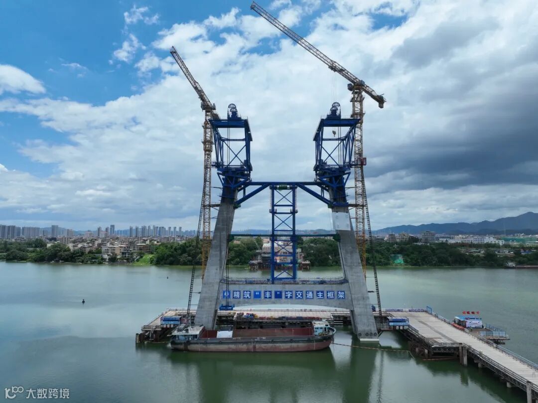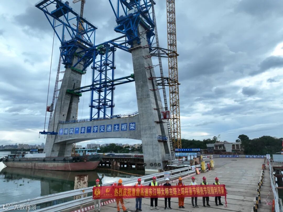 6月11日晚,保利长大惠州惠城至惠阳霞涌高速公路(简称惠霞高速)项目控制性工程——东江特大桥主塔首节钢壳节段顺利完成毫米级精准吊装,为后续上塔柱主体结构施工奠定了坚实基础。