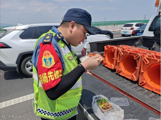 还没来得及稍作休息,对讲机里又传来了新的指令:“主线 K50 往珠海方向……请机动班前往支援。”“主线 K56……”朱绩幸和张浚林马不停蹄地赶往现场,迅速加入到交通指挥的队列中。烈日下,他手势标准、眼神专注,疏导着一辆又一辆车。待车流恢复顺畅,朱绩幸才稍稍放松了紧绷的身体,有了片刻休息的时间。此时队友送来的盒饭早已冰凉,朱绩幸匆匆扒拉几口,又转身投入到新一轮的“保畅战斗”中。