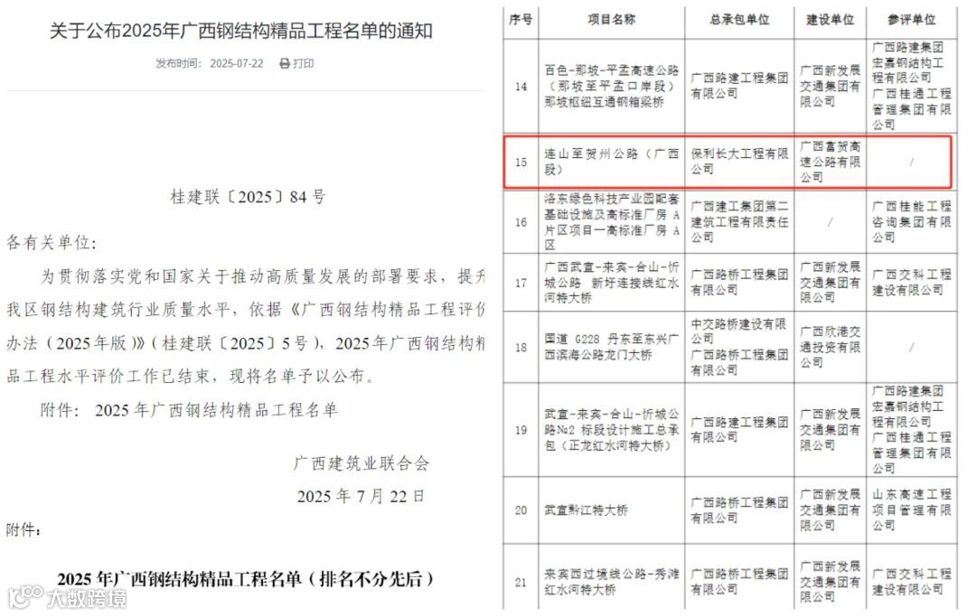 近日,广西建筑业联合会正式公布2025年度“广西钢结构金奖”获奖名单。由公司承建的连山至贺州高速公路项目榜上有名,斩获广西壮族自治区钢结构工程领域最高荣誉。