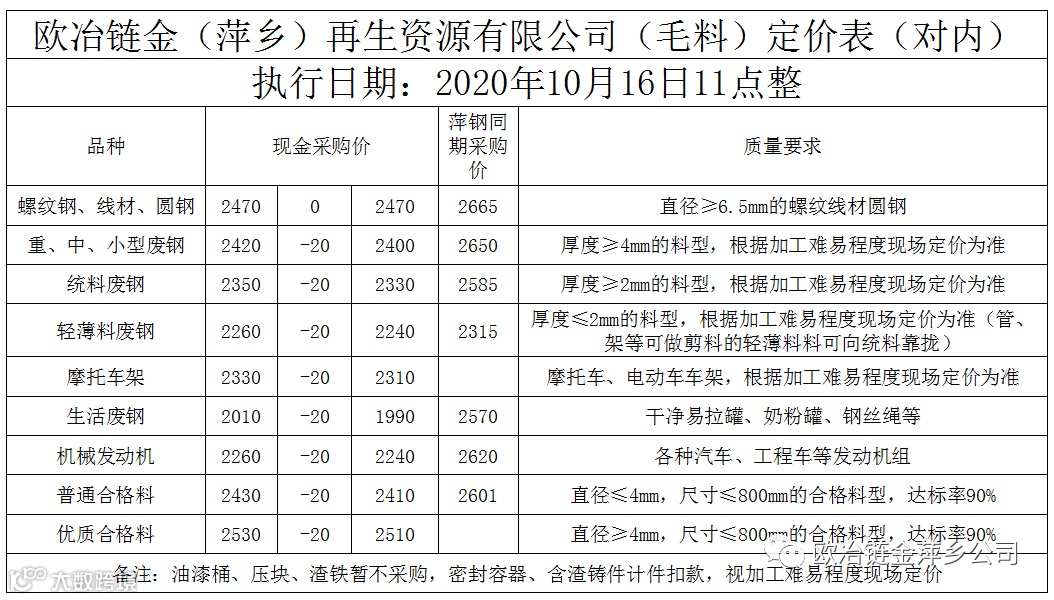 导读:各供应商:自2020年10月16日零时起,散料废钢,工业轻料压块,统料压块,刨花压饼下调20元/吨,其他料型暂不调整。详情请咨询我公司业务员!