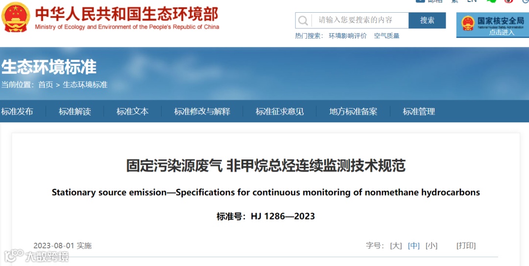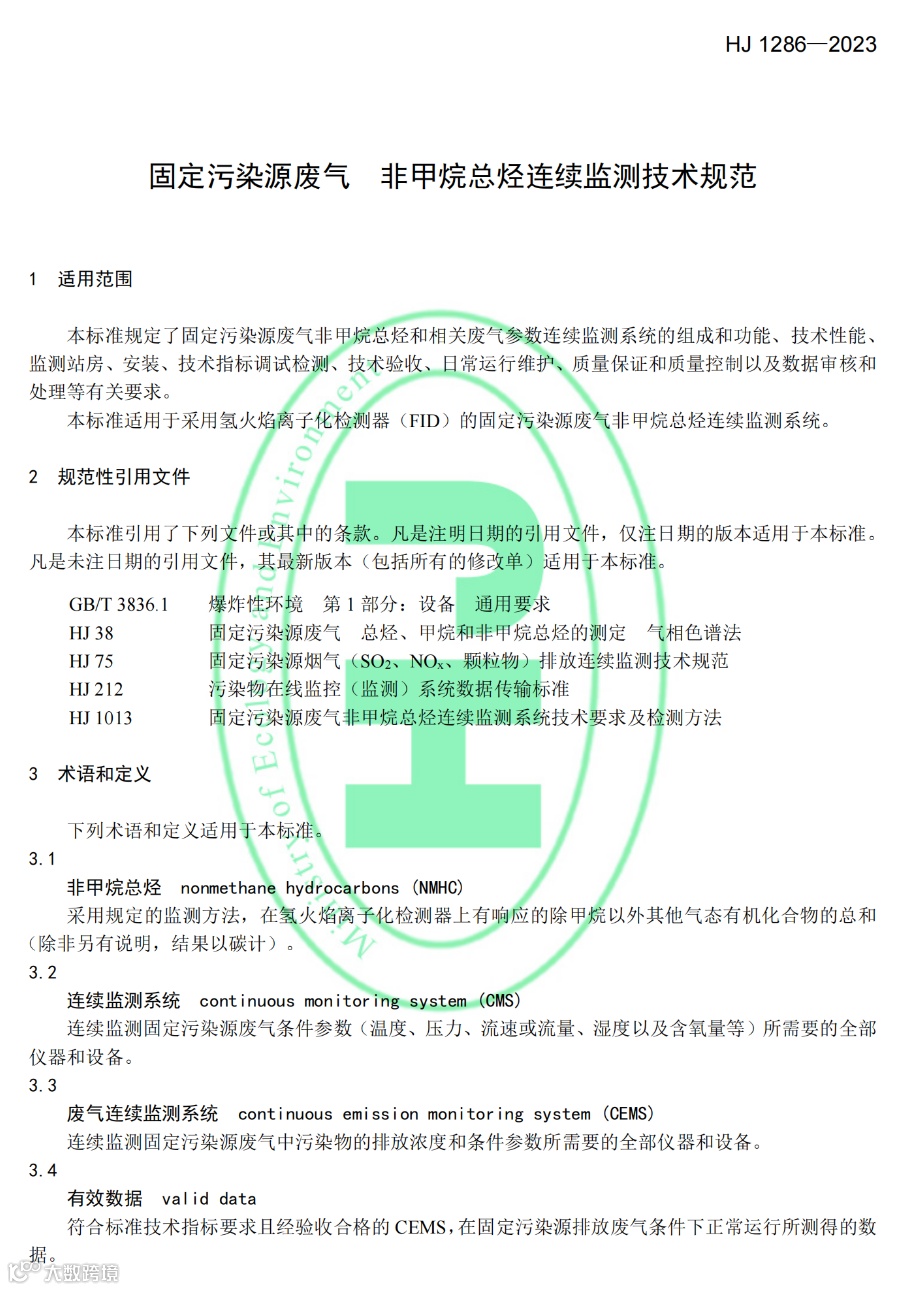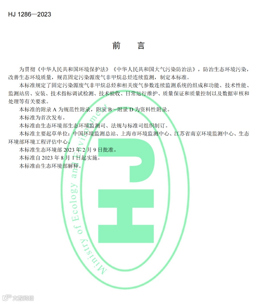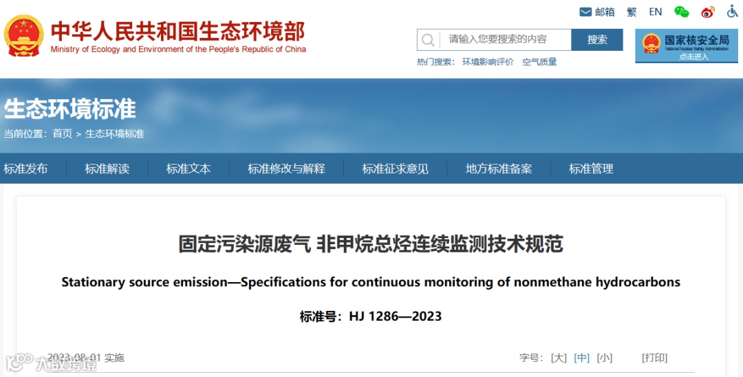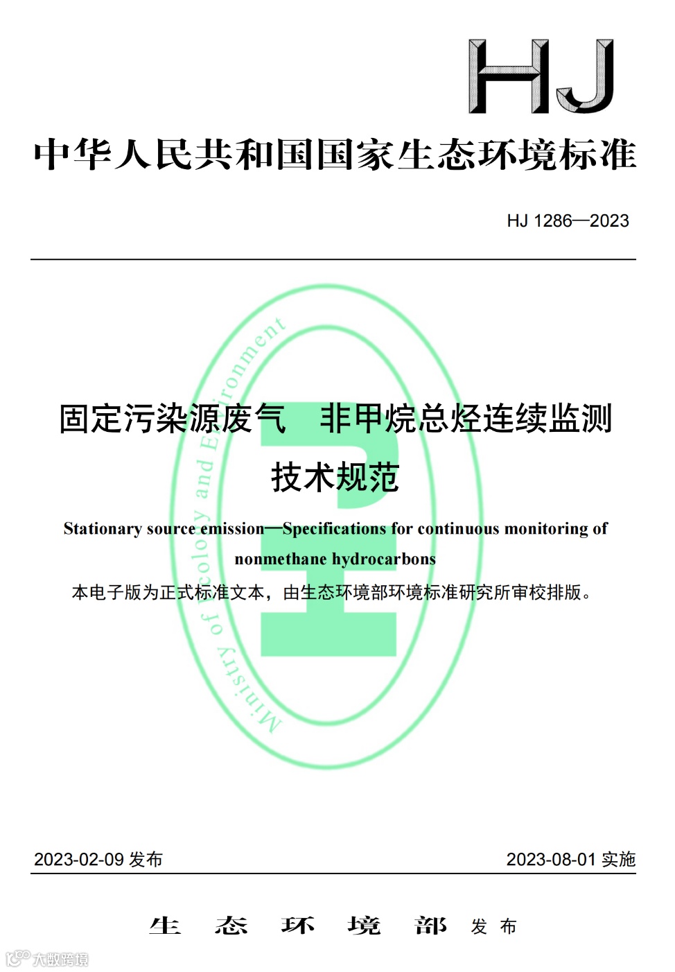 生态环境部于2023年2月9日正式发布《固定污染源废气 非甲烷总烃连续监测系统技术规范》(标准号:HJ 1286—2023),该标准规定了固定污染源废气非甲烷总烃和相关废气参数连续监测系统的组成和功能、技术性能、监测站房、安装、技术指标调试检测、技术验收、日常运行维护、质量保证和质量控制以及数据审核和处理等有关要求。该标准为首次发布并于2023年8月1号正式实施。