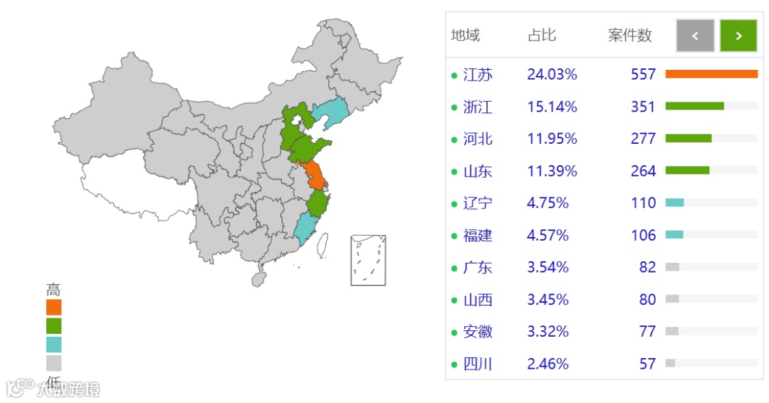 截止于2020年,危险废物类污染环境案案件数量的地域排名