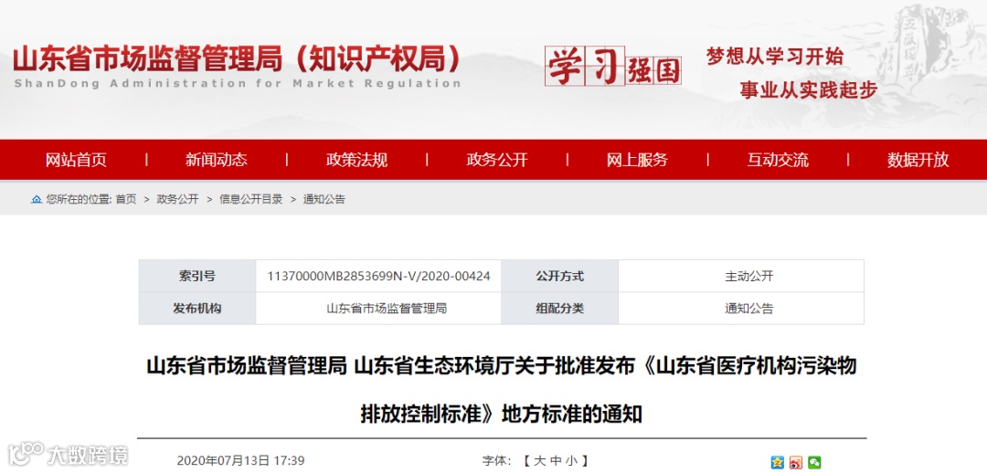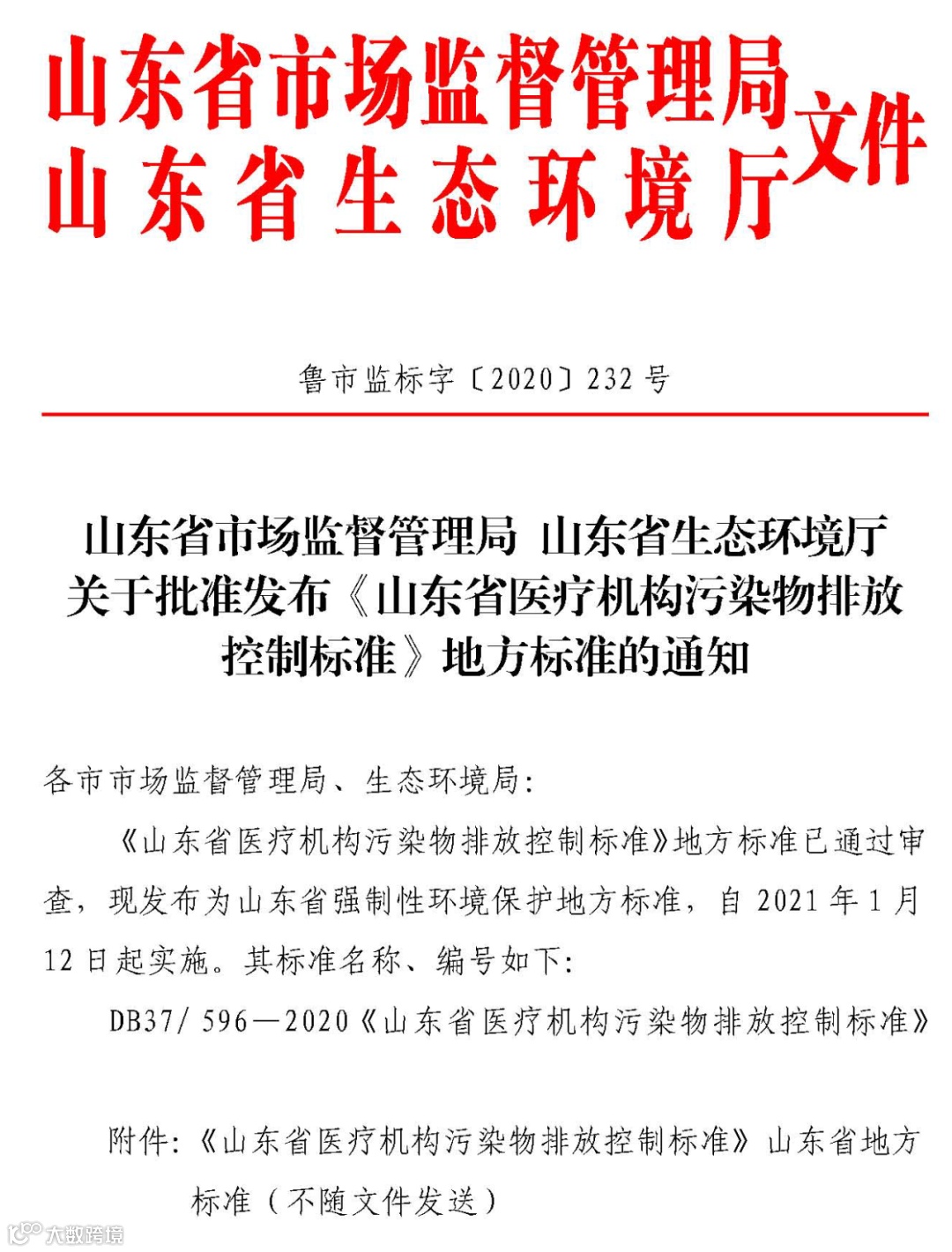 1.山东省市场监督管理局 山东省生态环境厅关于批准发布《山东省医疗机构污染物排放控制标准》地方标准的通知