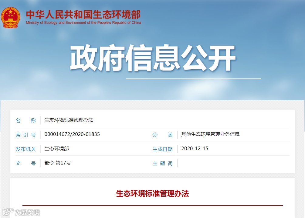 《生态环境标准管理办法》已于2020年11月5日由生态环境部部务会议审议通过,现予公布,自2021年2月1日起施行。
