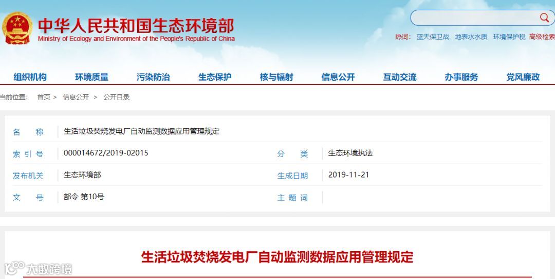 《生活垃圾焚烧发电厂自动监测数据应用管理规定》已于2019年10月11日由生态环境部部务会议审议通过,现予公布,自2020年1月1日起施行。