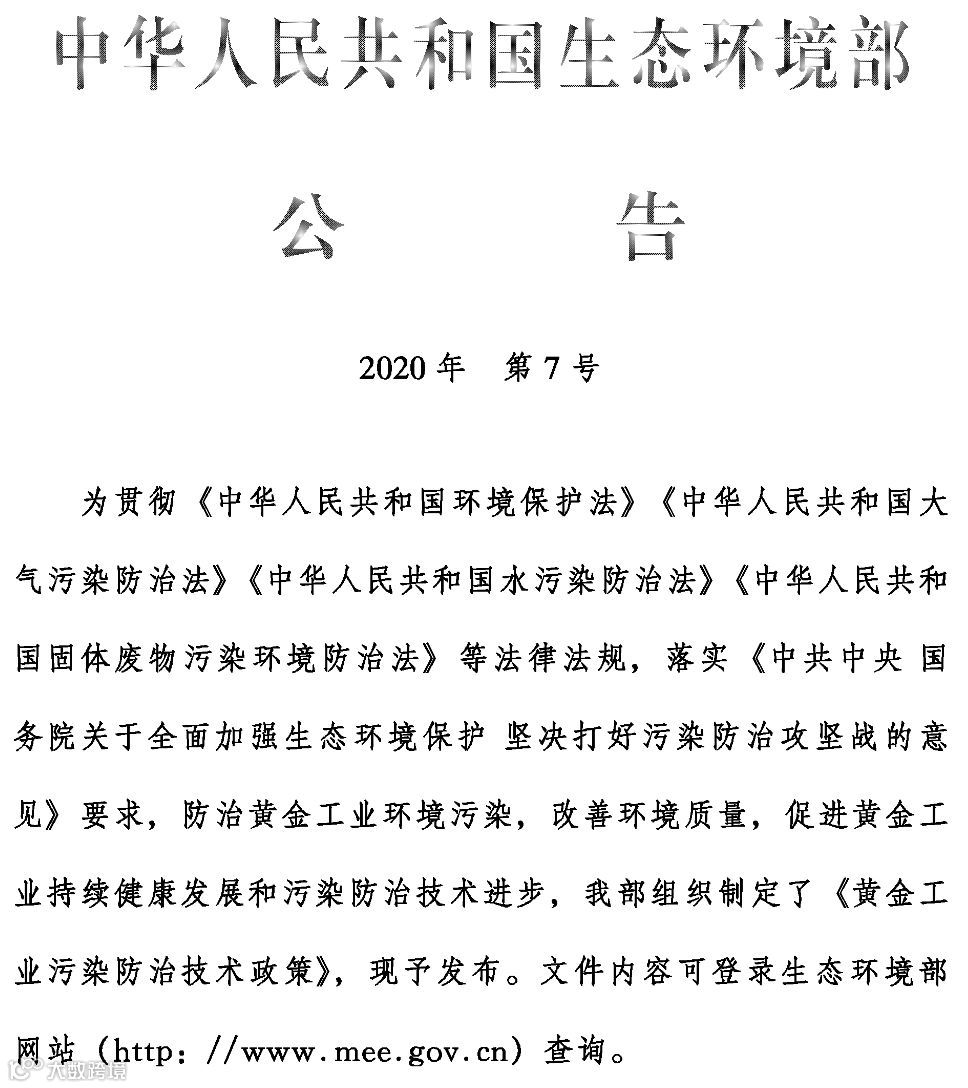 (公告 2020 年 第7号)《黄金工业污染防治技术政策》
