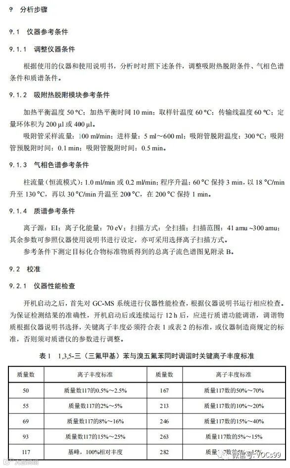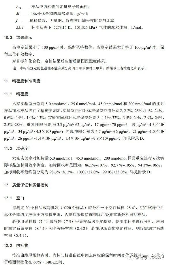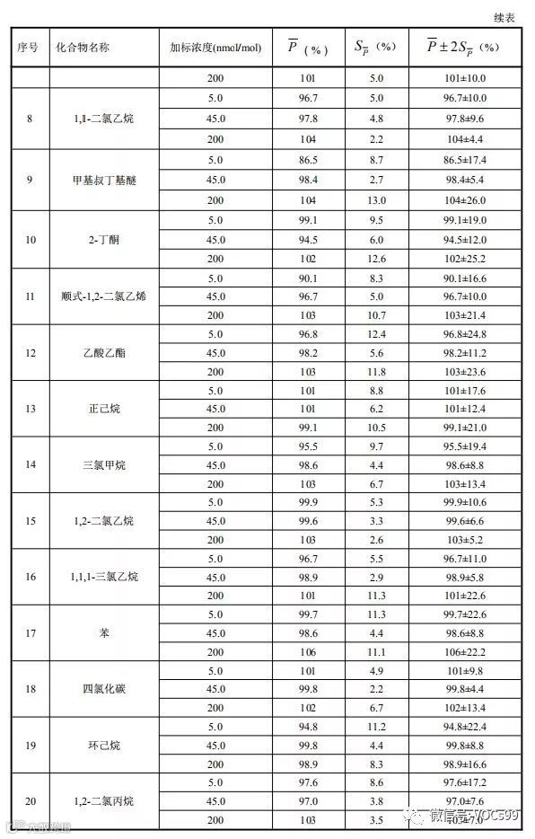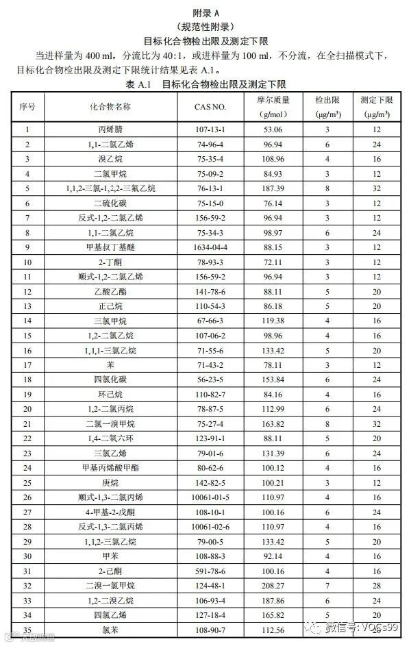 在全扫描模式下,采用本标准规定的进样量,方法检出限为 3 μg/m3~9 μg/m3,测定下 限为 12 μg/m3~36 μg /m3,详见附录 A。