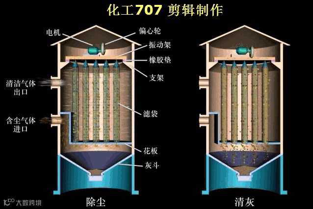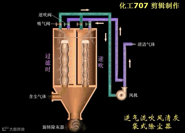气流通过滤袋,使其上的尘层脱落,掉入灰斗中。