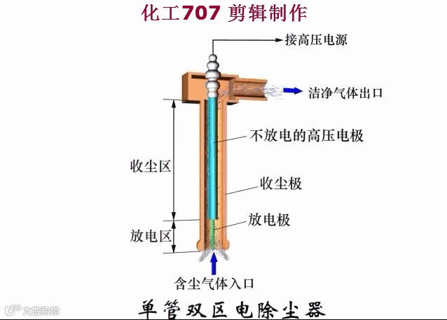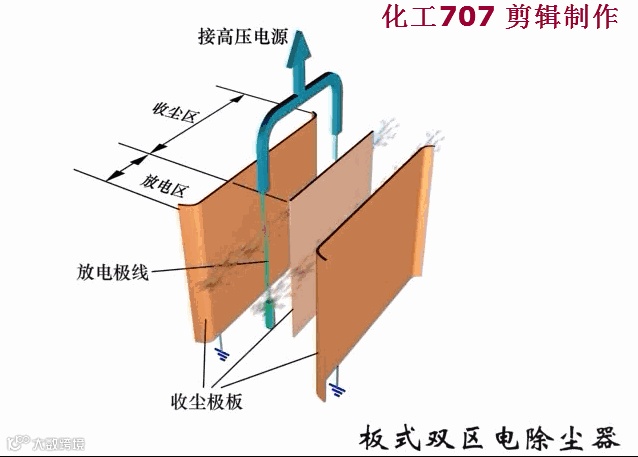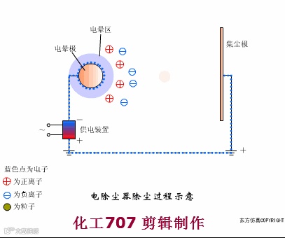 含有粉尘颗粒的气体,在接有高压直流电源的阴极线(又称电晕极)和接地的阳极板之间所形成的高压电场通过时,由于阴极发生电晕放电、气体被电离。