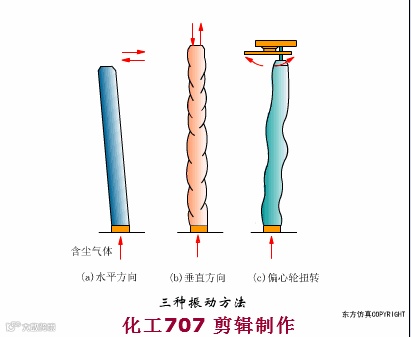 (c)为扭曲振动,它利用机械传动装置定期将滤袋扭转一定角度,使尘粒脱落。